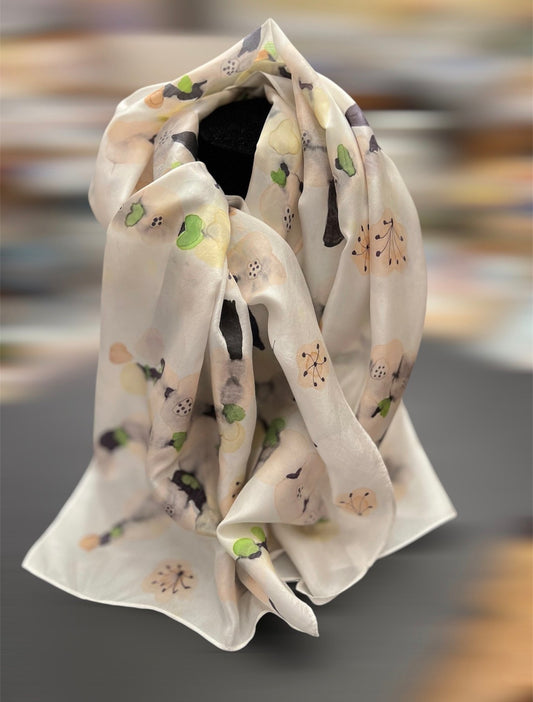 Each hand painted scarf is made from Habotai Silk and machine hemmed....