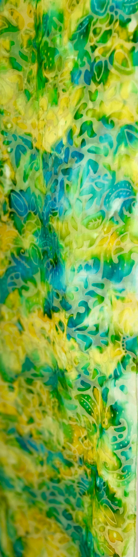 Each hand painted scarf is made from Habotai Silk and machine hemmed. They are hand painted and decorated with non-toxic Alcohol Ink dyes. They are steamed to set the dye and ensure long lasting enjoyment. Some of the scarves have a batik design and some have special folding designs such as Shibori. Each scarf is made one at a time and no two are alike. Hand wash in cold water and air dry. Iron on silk setting