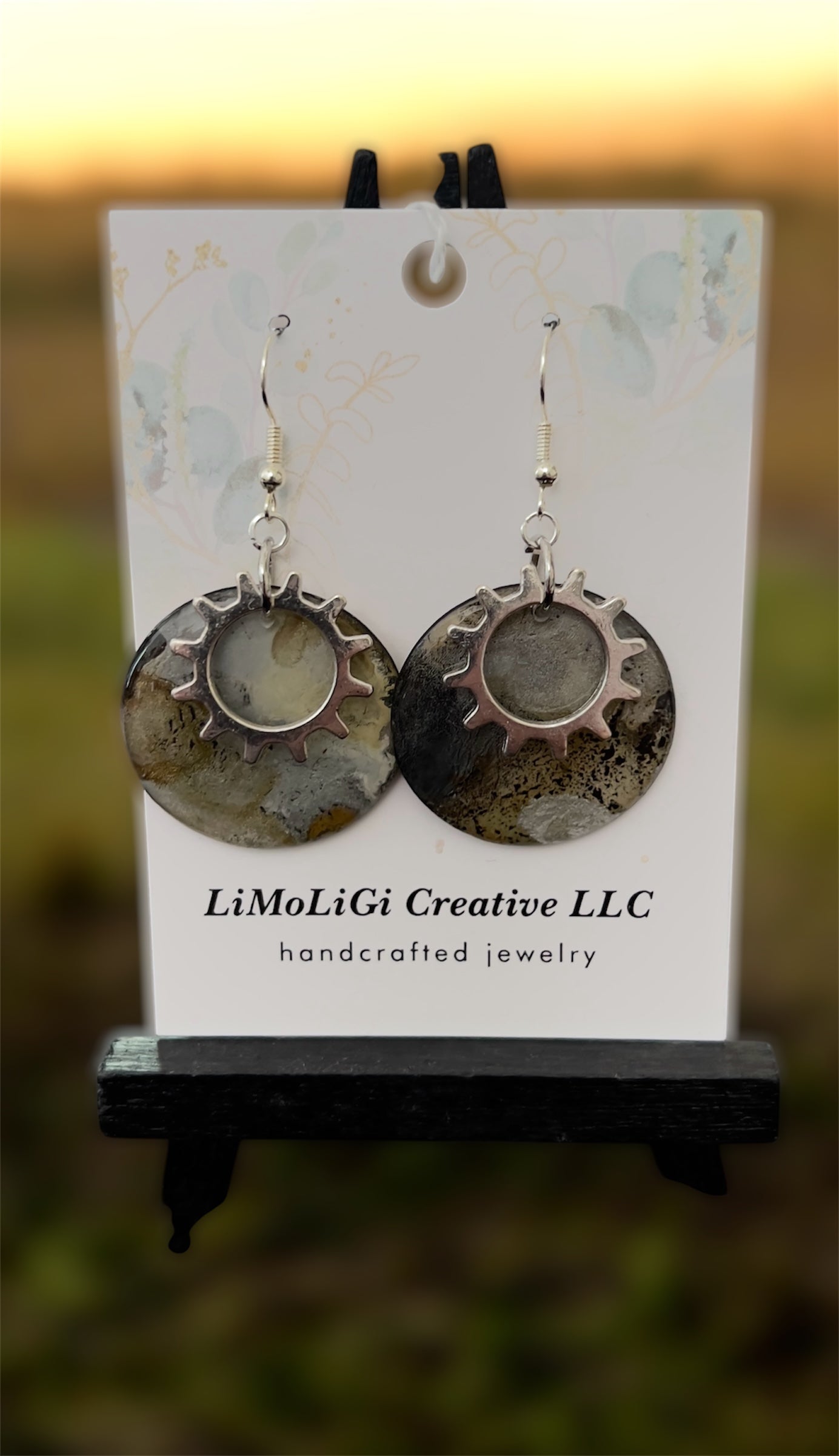 Alcohol ink painted earrings on synthetic paper, sealed and resin for protection. One-of-a-kind art as no earrings are the same. Earrings are cut from one original piece of art and cannot be duplicated.