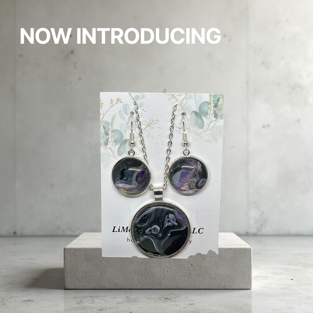 E25-047 Purple Flow Set I / Acrylic Pour in silver round setting with glass cabochon