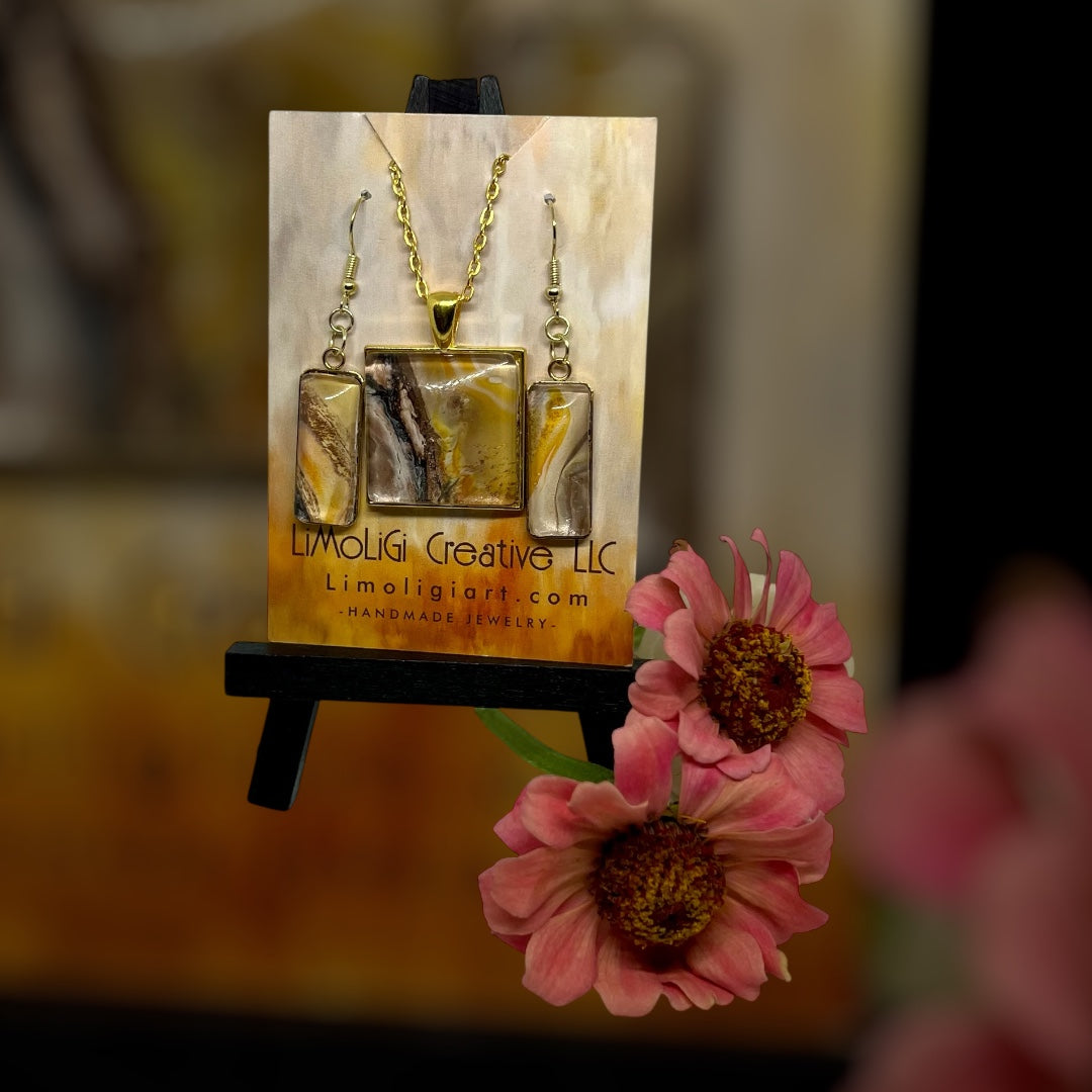E25-051 Brown Granite Set I - Acrylic Pour in gold square and rectangle settings with glass cabochon