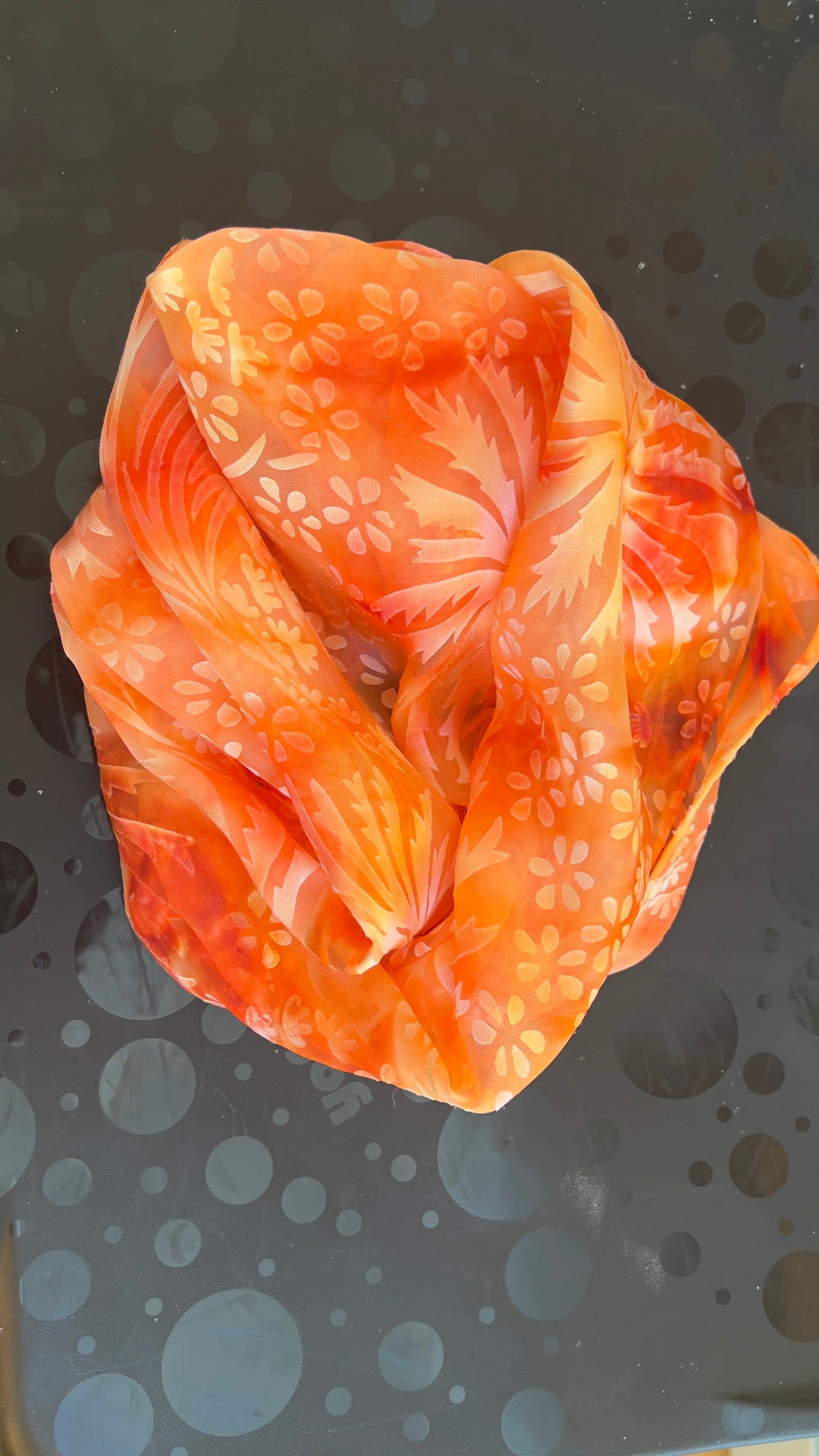 Rayon and Silk mum design with alcohol ink in Red, Orange, and Yellow with a Shibori Fold techinque.