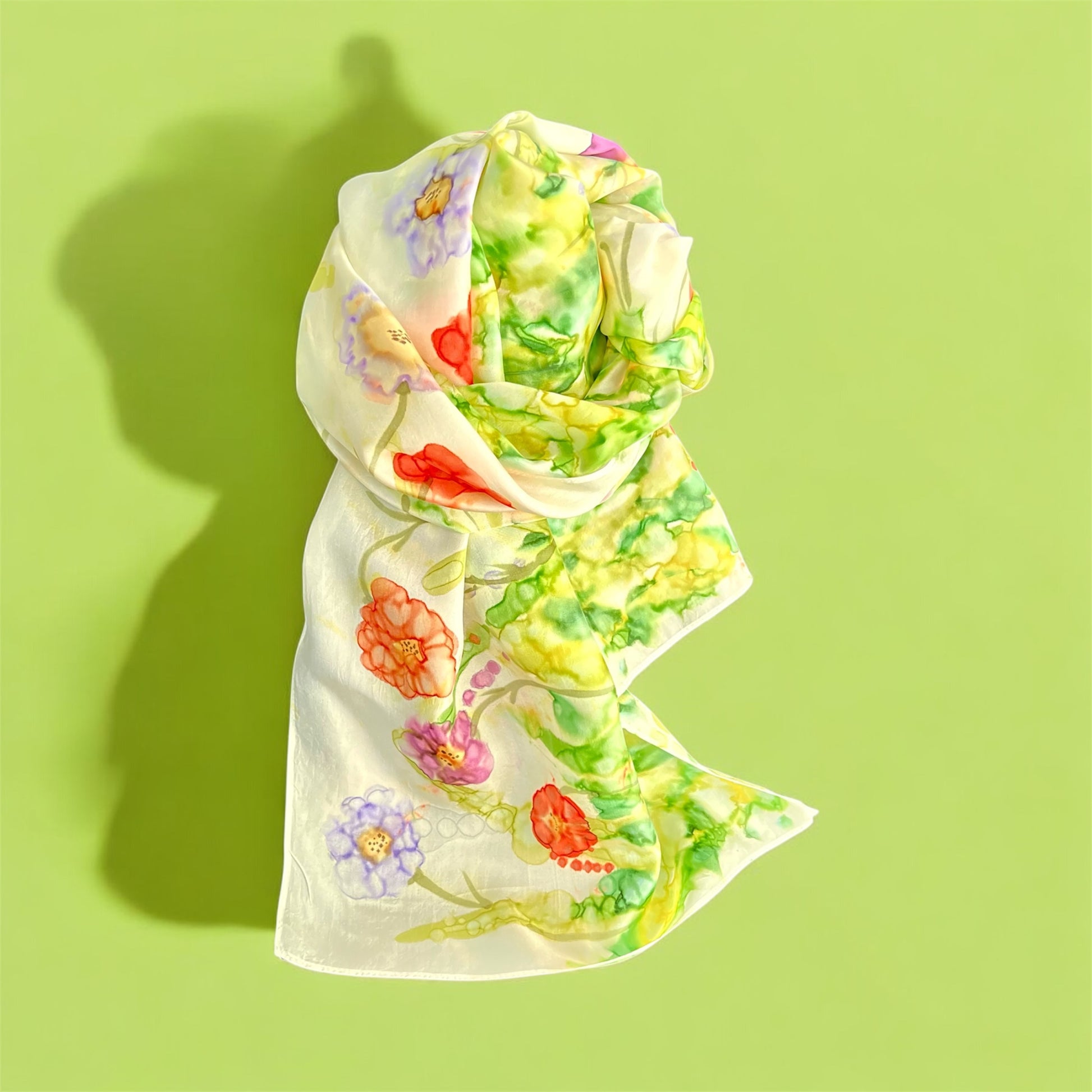 Hand Painted Alcohol Ink Silk in Red Purple Blue and Orange Flowers in Green Grass